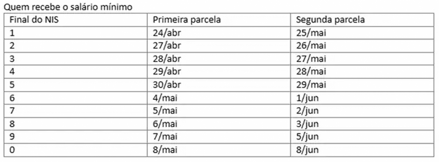 As datas são definidas com base no dígito final do Número de Inscrição Social (NIS) e com base na renda do beneficiário. Quem ganha apenas o salário mínimo começa a receber antes de quem recebe mais que o mínimo.